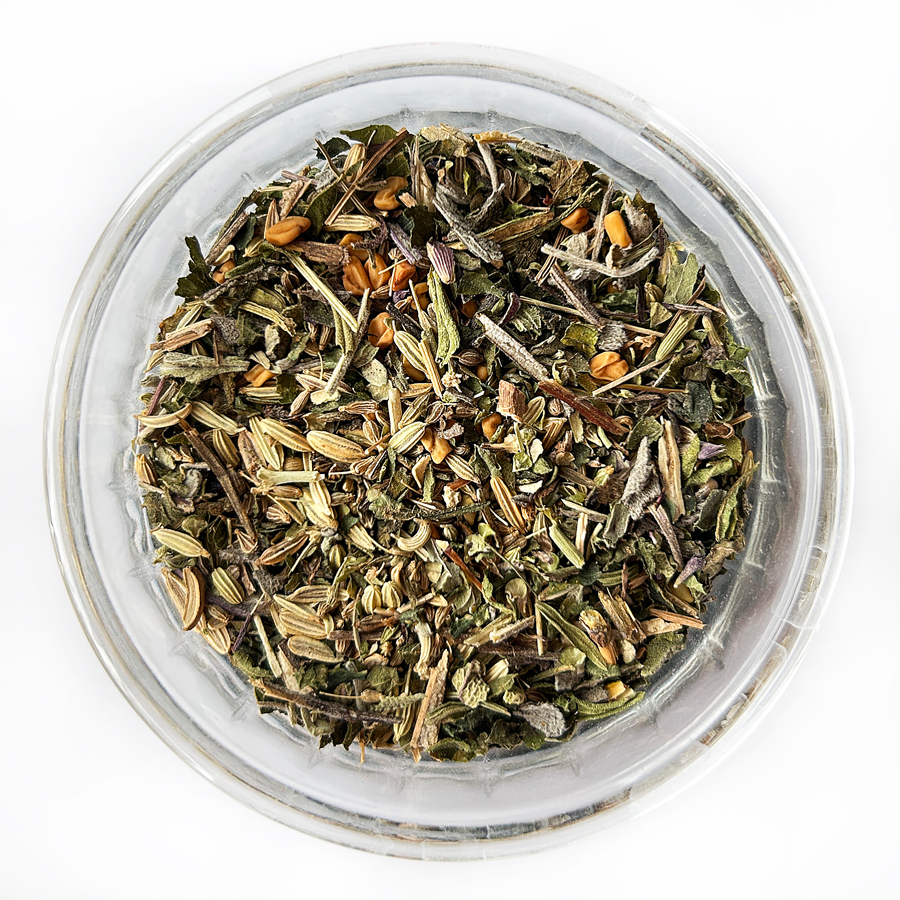Składniki: majeranek ziele, szałwia lekarska liść, mięta pieprzowa liść, koper włoski owoc, podbiał liść, anyż owoc, gorczyca nasiona, lukrecja korzeń, hyzop ziele, mniszek ziele, tymianek ziele, kozieradka nasiona, pokrzywa liść.