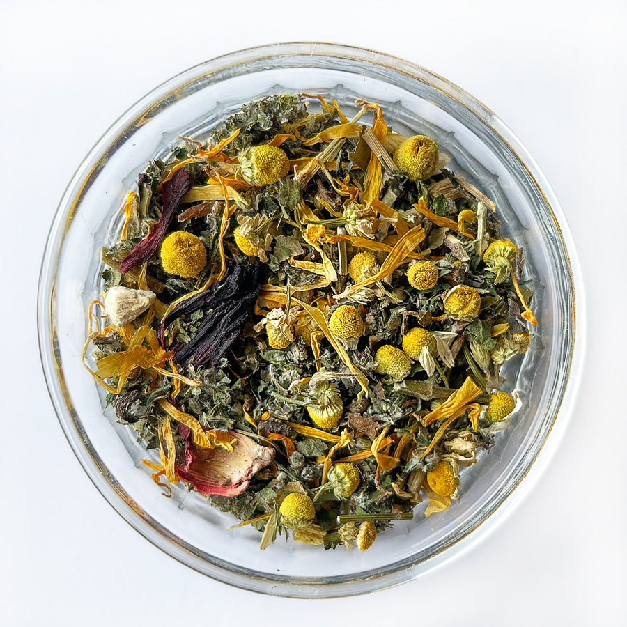 Składniki: jasnota biała ziele, bylica pospolita ziele, serdecznik ziele, przywrotnik ziele, rumianek kwiat, nagietek kwiat, krwawnik ziele, pokrzywa liść, malina liść, hibiskus kwiat, lukrecja korzeń, oman korzeń, kozieradka nasiona.