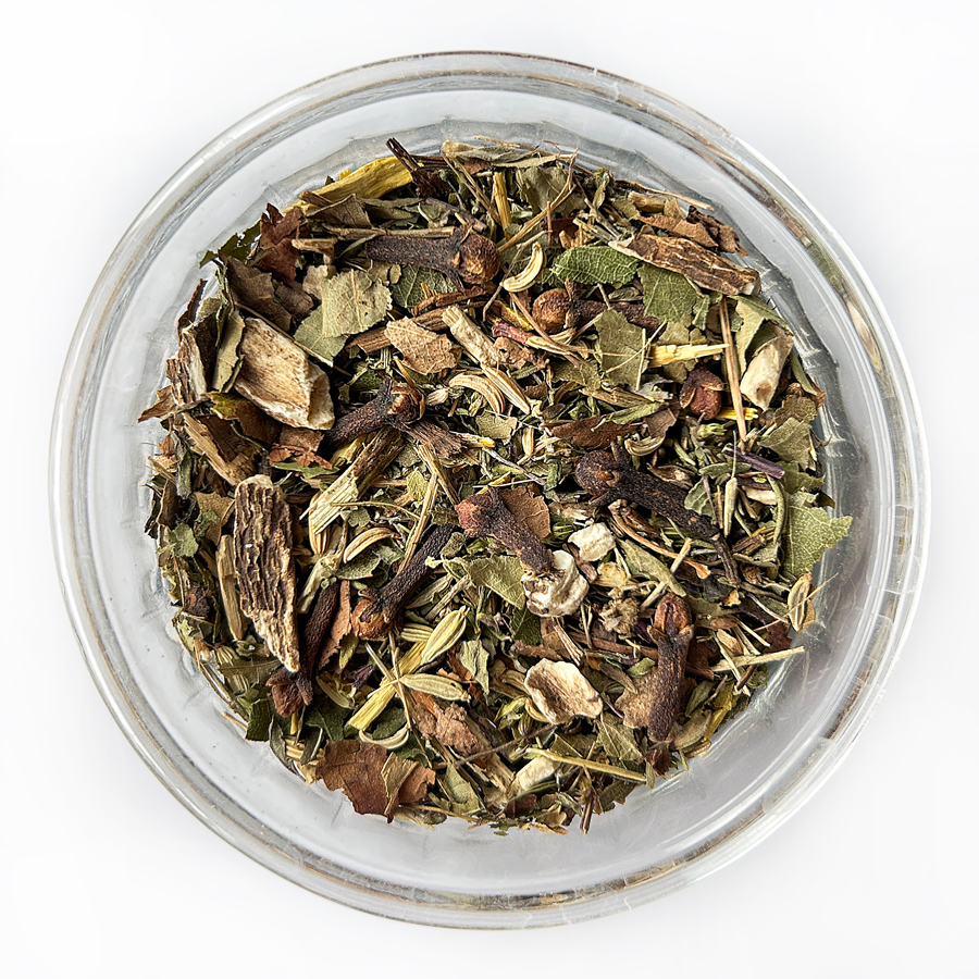 Składniki: tymianek ziele, orzech włoski liść, brzoza liść, mięta pieprzowa liść, oman korzeń, koper włoski owoc, piołun ziele, goździki, berberys zwyczajny korzeń.