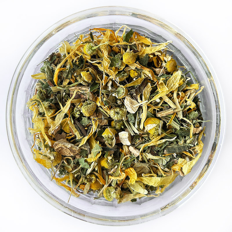 Składniki: fiołek trójbarwny ziele, nawłoć ziele, pachnotka ziele, nagietek kwiat, pokrzywa liść, porzeczka czarna liść, rumianek kwiat, czarnuszka nasiona, tatarak kłącze, łopian korzeń, tymianek ziele, krwawnik ziele, lukrecja korzeń.