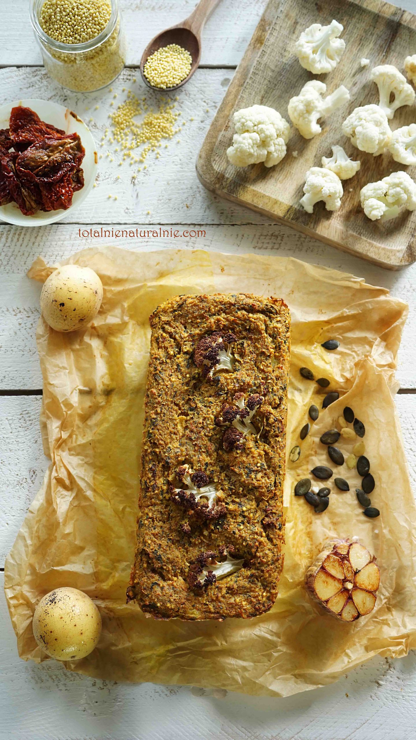 - Kalafiora i pomidory układamy w naczyniu żaroodpornym wyłożonym papierem do pieczenia, posypujemy przyprawami i wstawiamy do piekarnika rozgrzanego do 200 stopni na ok. 25 minut na funkcję termoobieg, aż kalafior zacznie się rumienić.